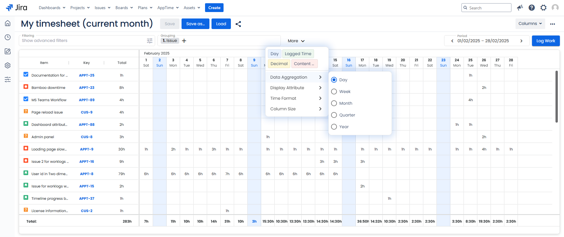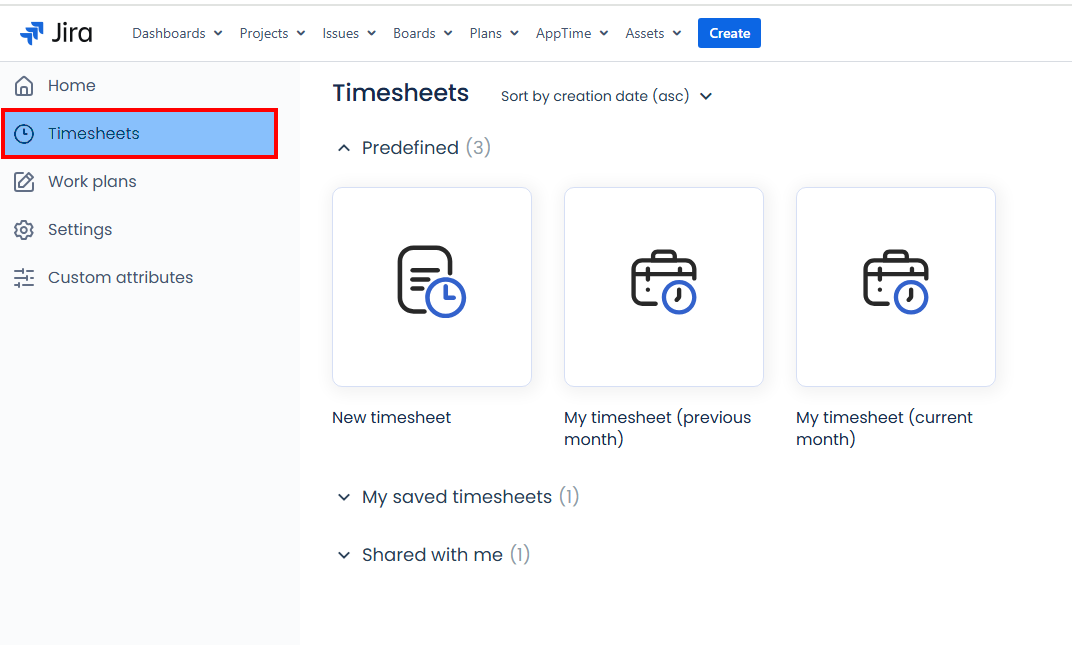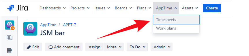 Select AppTime → Timesheets in the Jira's top navigation bar.