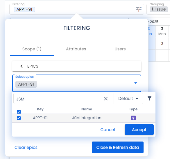 Scope - Projects, Issues, Sprints, Epics, Favourite filters, Ogranizations and JQL.
