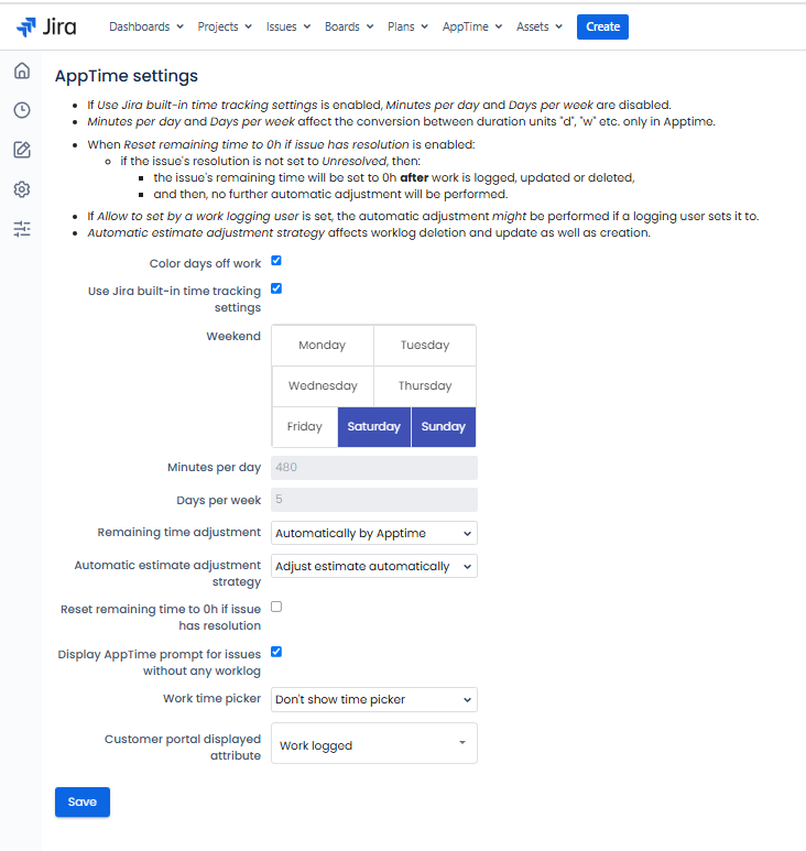 AppTime settings let you set and customize the tracking time rules within your Jira instance.