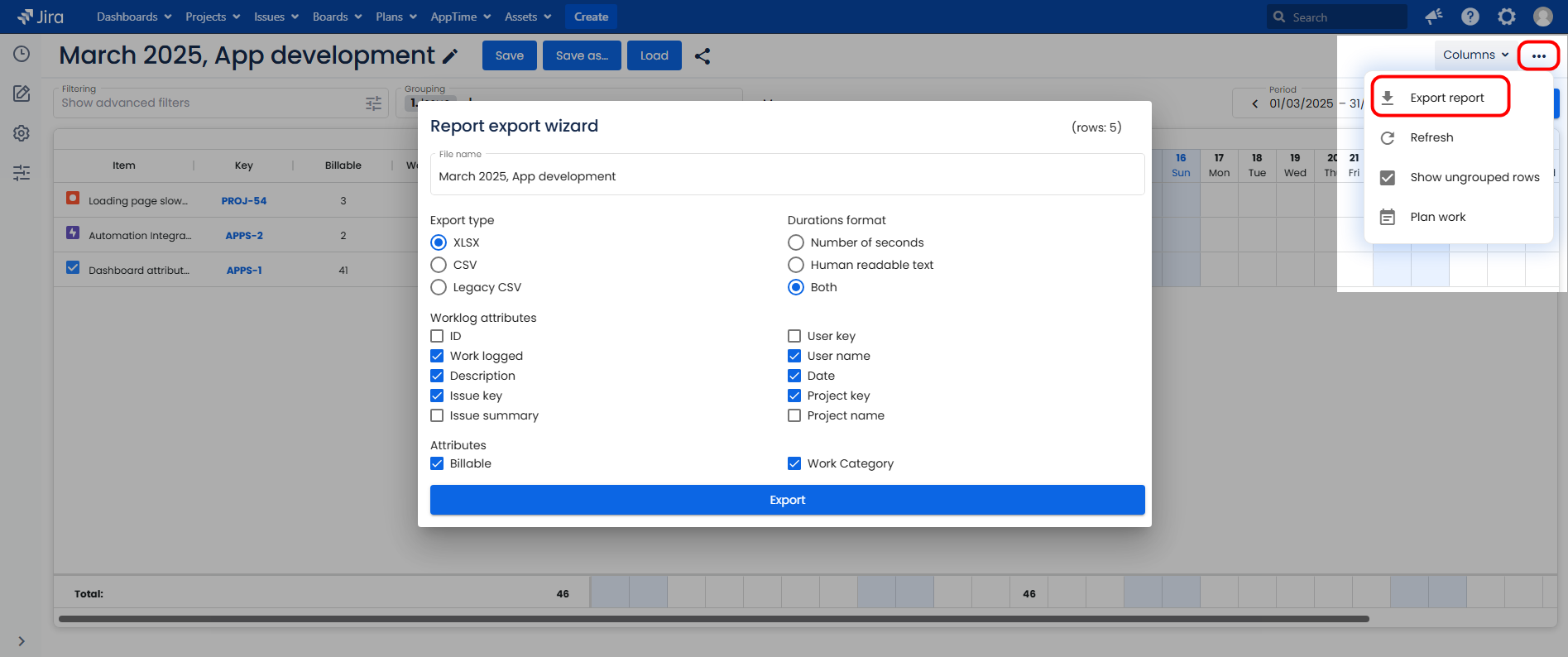 AppTime export feature allows users to pull their worklogs from Jira and download them in the selected format.