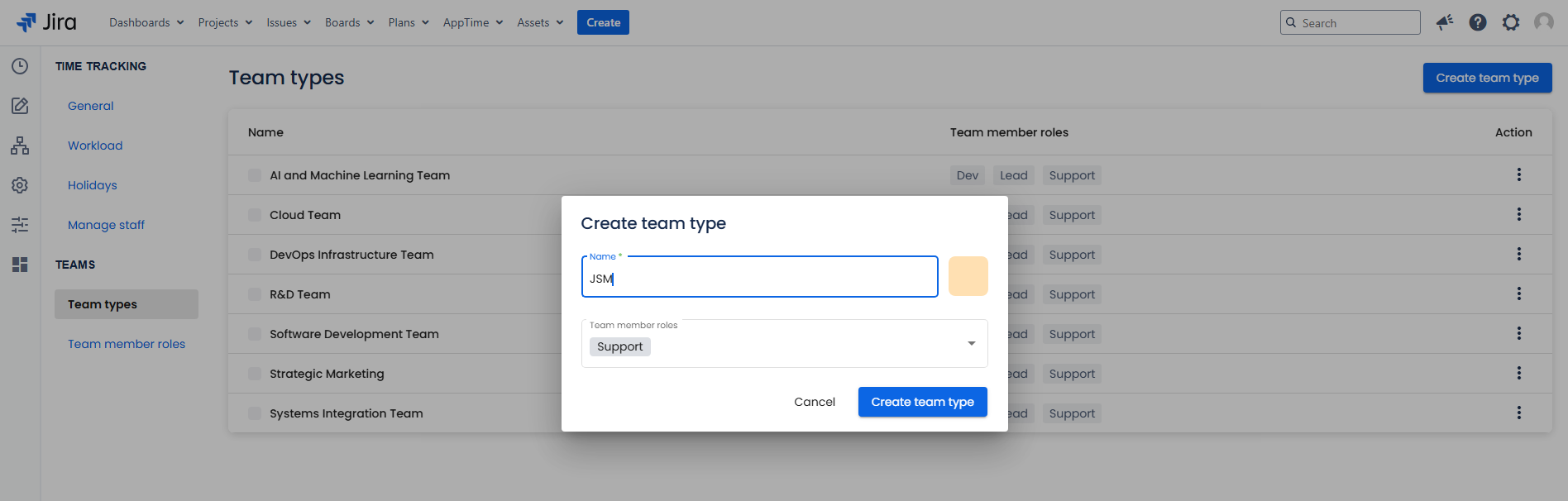 - From the sidebar menu, go to Settings → Team types→ click "Create team type" button at the top right-hand corner of the page.